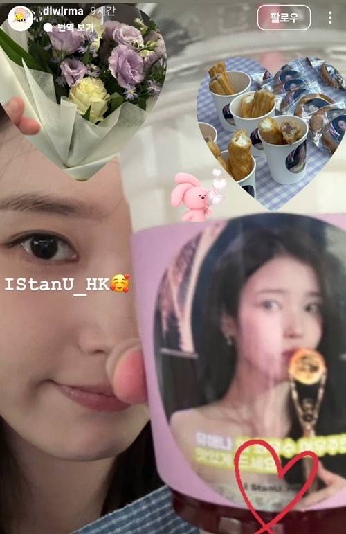 아이유는 26일 자신의 SNS를 통해 MBC 드라마 ‘21세기 대군부인’ 촬영장에서 받은 간식차 인증샷을 공개했다.