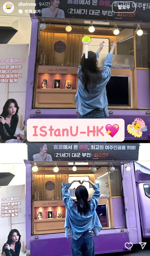 이어진 사진에서는 다른 팬 간식차 앞에서도 활짝 웃는 모습이 눈길을 끌었다. 보라색 간식차를 보낸 홍콩 팬클럽 ISTanU-HK의 응원 메시지에는 “최고의 여주인공을 위한 파이팅”이라는 문구가 담겼고, 아이유는 하늘색 셔츠 차림으로 손하트를 그리며 화답했다.