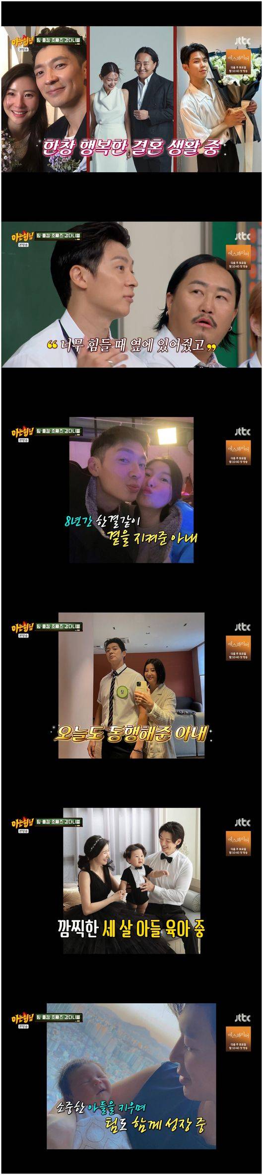 팀은 아내에 대해 자랑했다. 팀은 “우리 와이프는 나를 진짜로 살린 친구다. 너무 힘들 때 나를 살려줬고, 8년을 만났다. 내 소속사도 없는데, 와이프는 에이전시한 경험을 살려서 지금 내 회사의 대표다”라면서 이날 녹화에도 함께 왔다고 말했다.