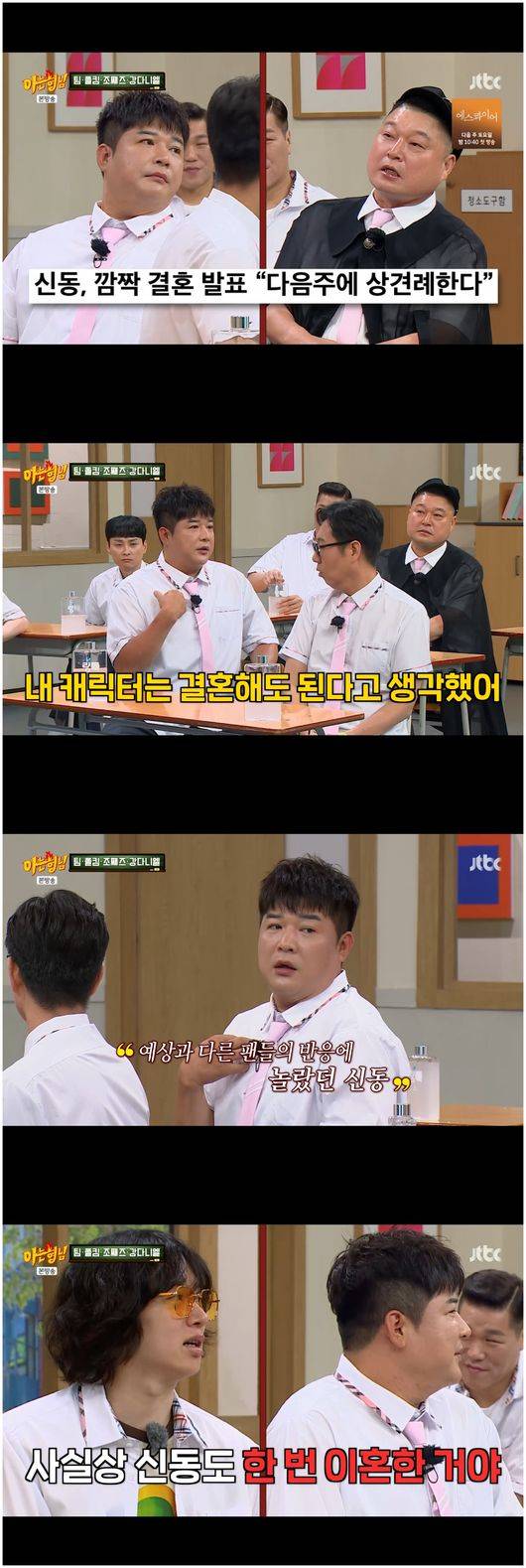 이에 대해 신동은 “내 캐릭터가 결혼을 해도 된다고 생각을 했는데, 팬들이 화를 내는 거 보고 깨달았다”라며 조심스럽게 그때를 회상했고, 겸손한 모습을 보였다. 그러자 김희철은 “사실 신동은 한 번 이혼한 거지”라고 말해 신동을 당황시켰다.
