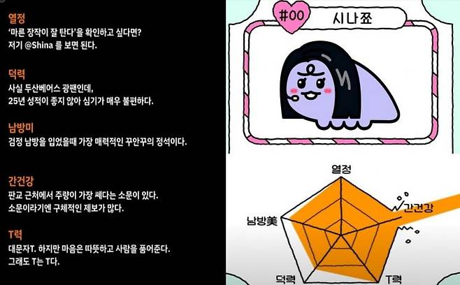 정신아 카카오 대표가 지난 24일 카카오톡 친구들에게 별안간 자신의 주량을 과시했다. 일정 시간 동안 카톡 애플리케이션(앱)에 짧은 콘텐츠를 올릴 수 있는 '펑'이라는 기능을 활용했다. 그는 자신을 소개하는 짤막한 글을 올렸는데 '사실 두산베어스 광팬인데 2025년 성적이 좋지 않아 심기가 매우 불편하다'고 고백했다. 또한 본인을 이성적 사고가 강하게 지배하는 '대문자T'라고 칭하면서도 '마음은 따뜻하고 사람을 품어준다'고 했다. '꾸민 듯 안 꾸민 듯'한 자신만의 패션 스타일로는 검은색 남방을 꼽았다. 카카오 인기 캐릭터 '쪼르디'에 정 대표의 모습을 입혀 '시나쬬'라는 이름을 가진 앙증맞은 일러스트를 공개하기도 했다.