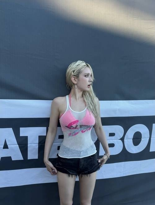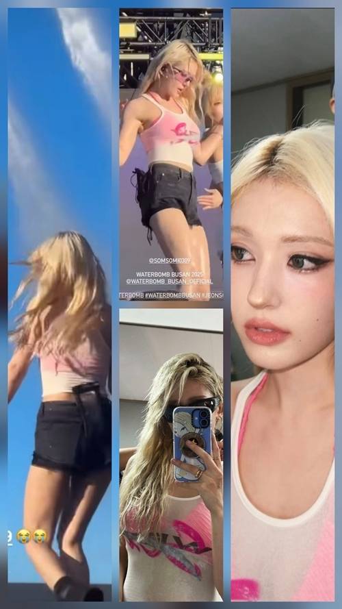 짧은 핑크 크롭톱과 블랙 데님 숏팬츠로 워터밤 특유의 물무대에 완벽하게 적응한 전소미는, 군살 없는 바디와 젖은 금발 웨이브 헤어로 무대 위 바비 인형 그 자체였다.