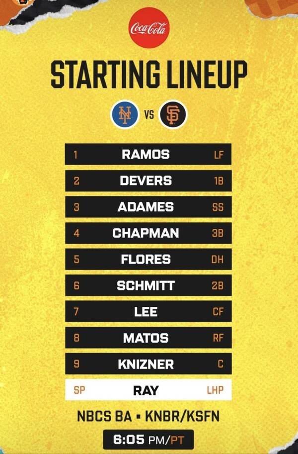 이날 샌프란시스코는 엘리엇 라모스(좌익수)-라파엘 데버스(1루수)-윌리 아다메스(유격수)-맷 채프먼(3루수)-윌머 플로레스(지명타자)-케이시 슈미트(2루수)-이정후(중견수)-루이스 마토스(우익수)-앤드류 키즈너(포수) 순으로 라인업을 구성했다. 선발 투수는 로비 레이다.