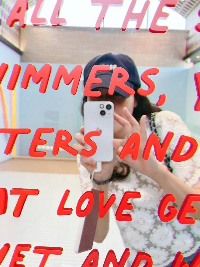 사진 속 김하늘은 빨간 레터링이 새겨진 거울을 배경으로 셀카를 찍고 있다.