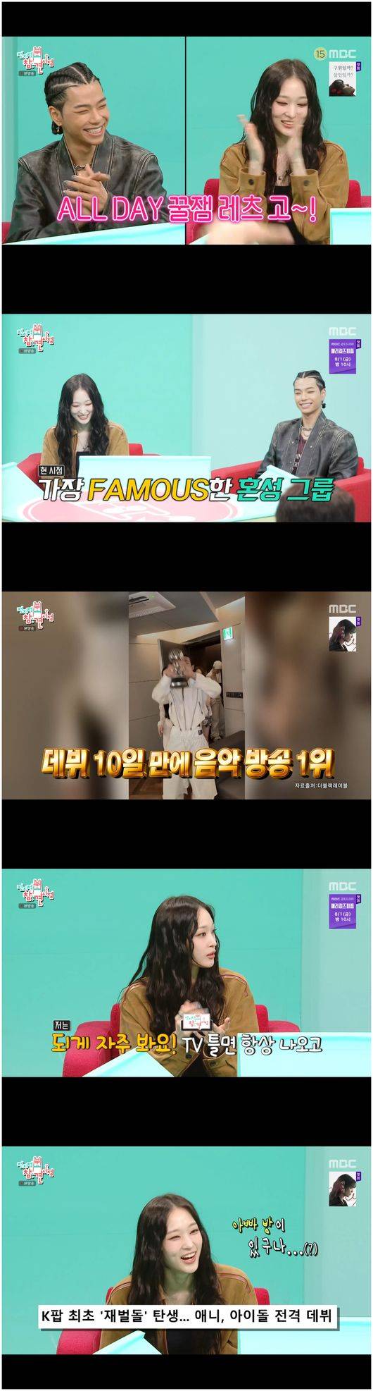 26일 방송된 MBC 예능 ‘전지적 참견 시점’(이하 ‘전참시’)에서는 혼성 그룹 특집으로 신인 그룹 '올데이 프로젝트'와 코요태가 등장했다. 올데이 프로젝트는 대중에게 유난히 알려진 애니와 타잔이 등장했는데, 이들은 각각 특징이 있었다. 애니의 경우 신세계 회장의 손녀로 알려져 있으며, 아이비리그 출신 수재였다. 또한 타잔은 국내 콩쿠르 수상에 패션 모델을 경험한 인재였다.