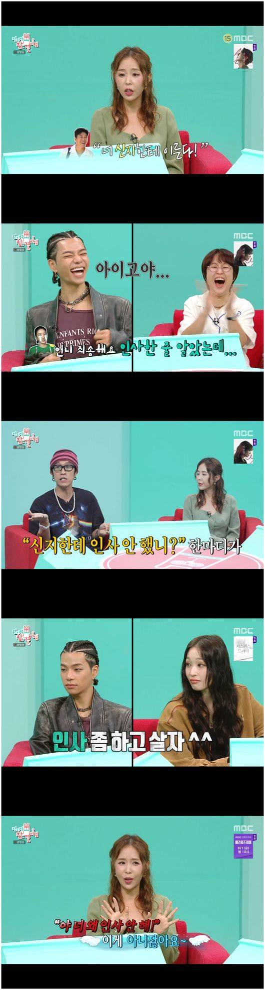 송은이는 “혼성 그룹 장단점이 뭐냐”라며 이들에게 물었다. 빽가는 “정리해 줄 사람이 있다. 신지가 정리를 해 준다. 단점은”이라고 말하더니 신지의 눈치를 슬쩍 봤다. 타잔은 “저도 말하자마자 애니 눈치를 봤다”라며 공감해 애니를 어이없게 만들었다.
