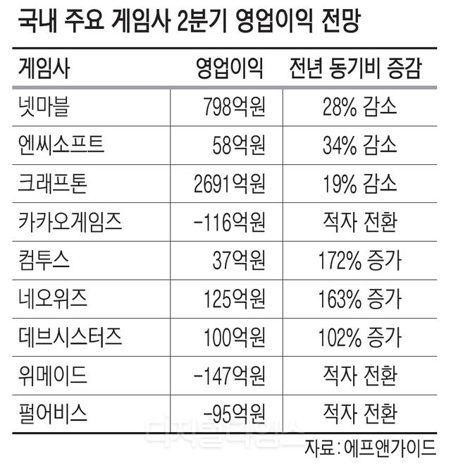 금융정보업체 에프앤가이드에 따르면 넷마블은 2분기 매출 7146억원, 영업이익 798억원으로 전년 동기 대비 각 8.6%, 28% 감소할 것으로 예상된다. 크래프톤의 영업이익은 전년 같은 기간 대비 19%, 엔씨소프트는 34% 줄어들 것으로 전망된다. 카카오게임즈는 적자전환할 것으로 예상됐다.