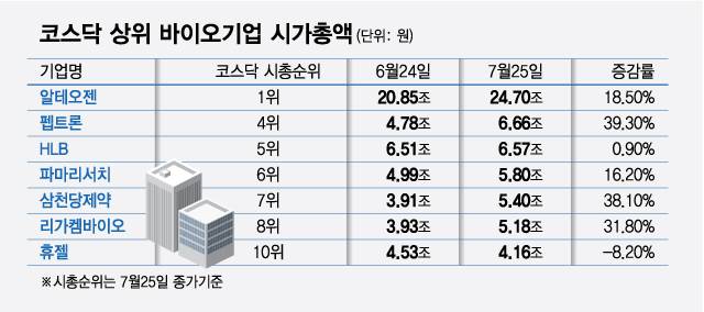 코스닥 시가총액 상위권을 장악한 바이오 기업들이 관련 지수까지 대폭 끌어올렸다. 시총 순위 10위 내 포진한 7개사가 한 달 사이 평균 20%에 달하는 시가총액 증가 폭을 보인 것 배경이다.