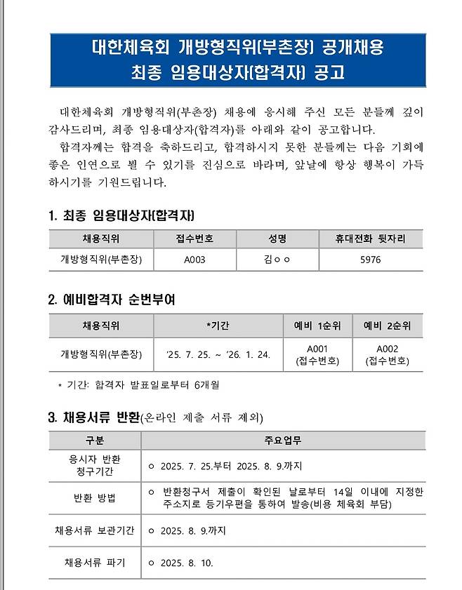 문화체육관광부는 25일 대한체육회 개방형 직위 부촌장 공개채용 최종임용 대상자(최종합격자)로 김칠봉 전 대한체육회 훈련본부장을 발표했다. 유승민 대한체육회장의 임명 절차를 거쳐 8월 초 임기를 시작한다. 국가대표 선수촌 부촌장제는 지난 2017년 신설된 후 '체조 레전드' 이호식(현 KT스포츠단 대표), '여자유도 레전드' 정성숙(현 여자유도대표팀 감독), '근대5종 선수 출신 행정가' 정동국 부촌장이 차례로 역임해왔다. 부촌장 임기는 2년이고, 선수촌장을 보좌하는 한편 2026년 밀라노·코르티나 동계올림픽을 앞두고 평창선수촌을 중심으로 근무하게 된다.