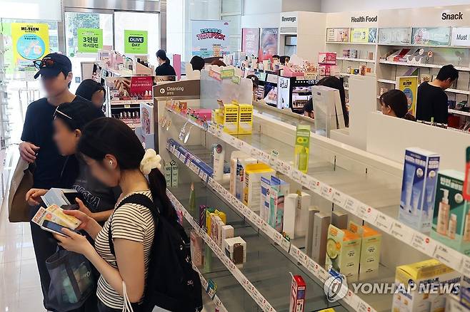 (서울=연합뉴스) 임화영 기자 = 27일 '민생회복 소비쿠폰' 사용 가능 매장인 서울 시내 한 올리브영 가맹점 진열대가 텅 비어 있다. 2025.7.27