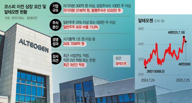 27일 금융감독원 전자공시시스템에 따르면 알테오젠은 코스피 이전 상장을 위한 형식적 요건을 모두 갖췄다. 코스피에 이전 상장하기 위해서는 자기자본 300억 원 이상, 100만 주 이상의 기업 규모 요건을 갖춰야 하고 일반주주의 비율이 25%를 넘겨야 한다. 알테오젠은 올 1분기 기준 자기자본 3746억 원, 발행주식수 5332만 주, 일반주주 비율 73.8%로 요건을 충족한다. 알테오젠의 25일 종가 기준 시총도 24조 7008억 원으로 경영성과 요건인 시총 1조 원 이상에 부합한다. 3년간 적정 감사의견을 받아 감사의견 요건도 만족했다.