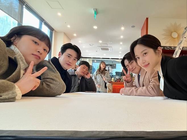 사진에는 극 중 어쏘 변호사로 호흡을 맞추고 있는 문가영, 강유석, 류혜영, 임성재와 함께 식사를 하거나 장난스럽게 포즈를 취하는 등 다정한 모습이 담겼다. 촬영장에서는 음식점에 둘러앉아 음식을 나누는 자연스러운 순간부터 테이블에 둘러 앉아 환하게 웃거나 브이(V) 포즈를 하는 등 활기찬 분위기가 포착됐다.