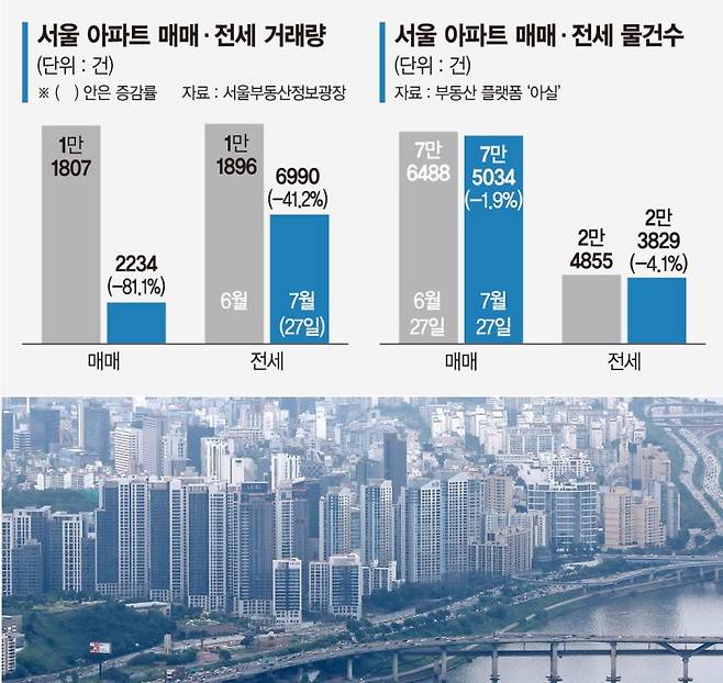 27일 업계에 따르면 정부의 초강력 대출 규제 이후 현장에서는 호가는 유지된 채 거래만 위축되는 현상이 두드러지고 있다. 서울부동산정보광장에 따르면 7월 서울 아파트 매매 거래량은 이날 기준 2234건으로, 전월(1만1807건) 대비 5분의 1 수준으로 줄었다. 같은 기간 전세 거래량도 6990건으로, 전월(1만1896건)보다 41%가량 감소했다.