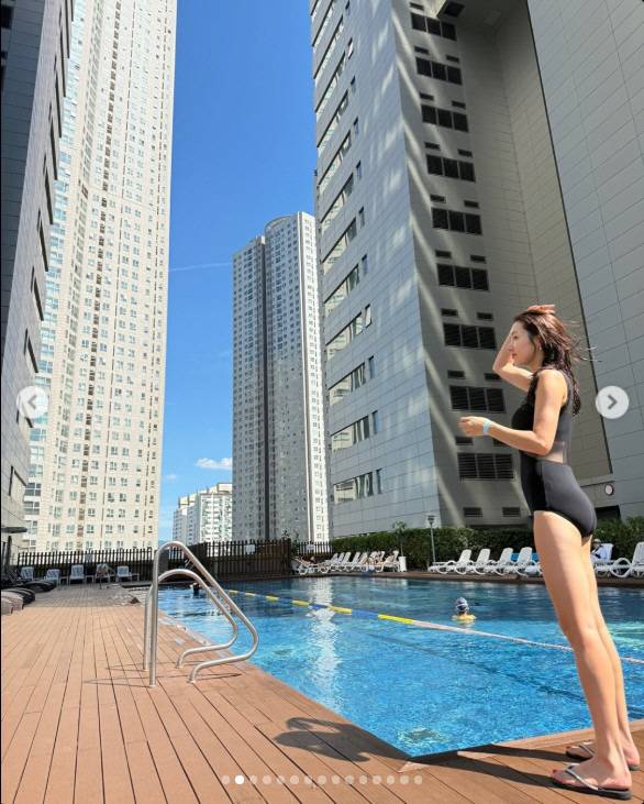 공개된 사진 속 소이현은 도심 속 야외 수영장에서 블랙 원피스 수영복을 입고 여름을 만끽하는 모습.