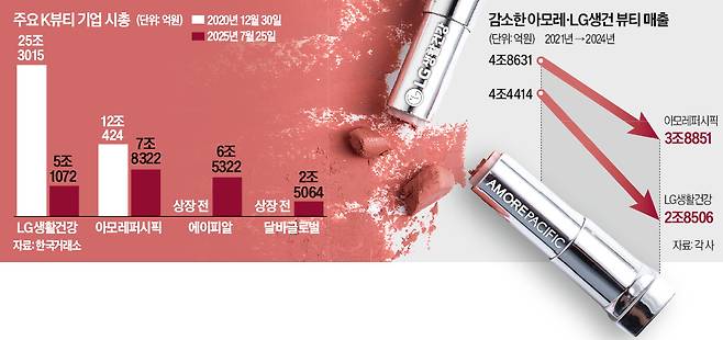 한때 국내 대표 화장품 기업이었던 LG생활건강과 아모레퍼시픽의 부진은 실적에서도 드러난다. 27일 각 사에 따르면 지난해 아모레퍼시픽 뷰티 매출은 3조8851억원, LG생활건강은 2조8506억원이다. 전성기인 2021년 대비 각각 20.1%, 35.8% 급감했다. 같은 기간 영업이익도 35.8%, 83.3%씩 줄었다. ‘황제주’였던 LG생활건강 주가는 2020년 12월 160만원대에서 지난 25일 32만원대로, 아모레퍼시픽은 20만원대에서 13만원대로 내려앉았다.