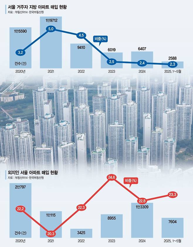 올 1~5월 서울 거주자 지방 아파트 매입 비중은 집값이 폭등했던 2020년 이후 가장 낮은 수치이다. 지방 전체 거래에서 서울 거주자 비중을 보면 2020년 3.2%, 2021년에는 5.0%로 상승했다. 2021년에는 원정투자 붐이 일기도 했다. 하지만 이후 2022년 4.5%, 2023년 2.5%, 2024년 2.4%, 2025년 2.3% 등으로 계속 추락하고 있다. 서울 거주자의 지방 아파트 외면이 심상치 않는 상황이다.