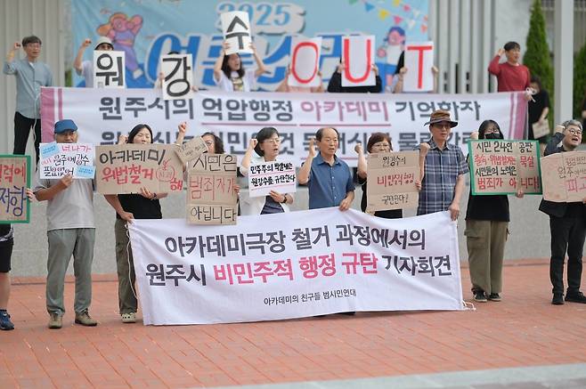 | ▲ 아카데미의 친구들은 2025년 7월 14일 마지막 공판 후 철거된 아카데미 극장 부지에서 기자회견을 진행했다. |