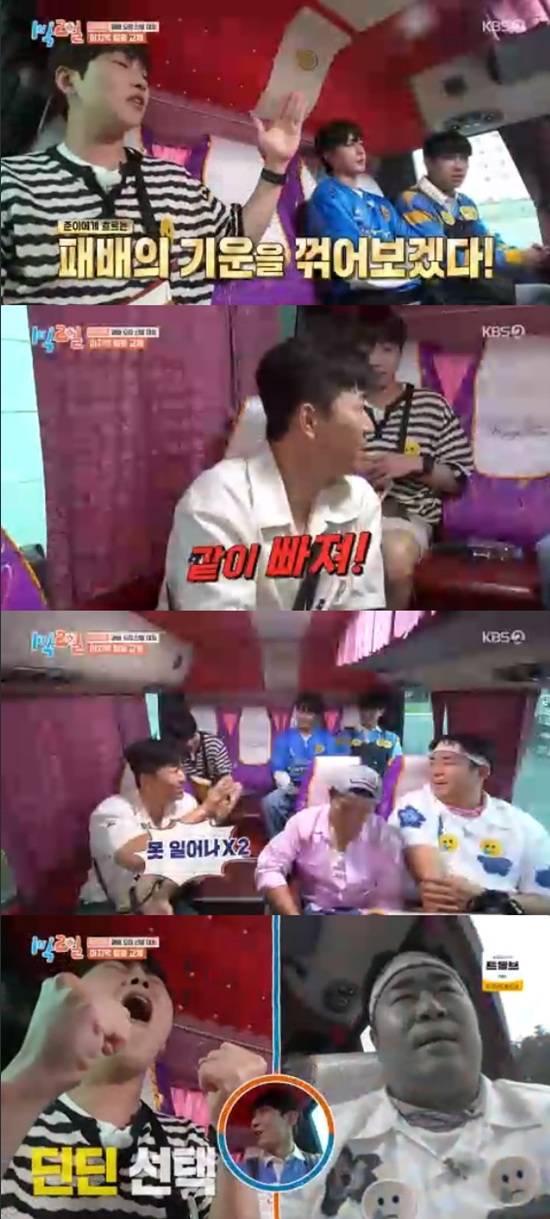 이날 멤버들은 해변 근처 횟집으로 이동했다. 이준 팀 김종민은 앞선 게임에서 패배한 것을 두고 "팀을 잘못 먹었다"고 이준 탓을 했다.