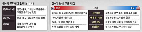 이런 분야들보다는 일본의 '5500억달러(약 761조원) 투자 약속'에 따라 큰 변수로 떠오른 투자나 농축산물 시장 추가 개방을 두고 미국의 노골적 압박에 어떻게 대응할지가 큰 관심사다.