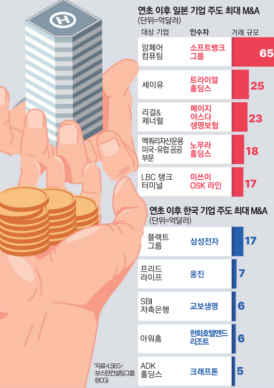 투자은행(IB) 업계 관계자는 “일본은 아시아에서 가장 높은 해외 M&A 비중을 보이는 국가로 꼽히고 있다”며 “일본 시장의 한계를 극복하기 위한 노력으로 풀이된다”고 말했다.