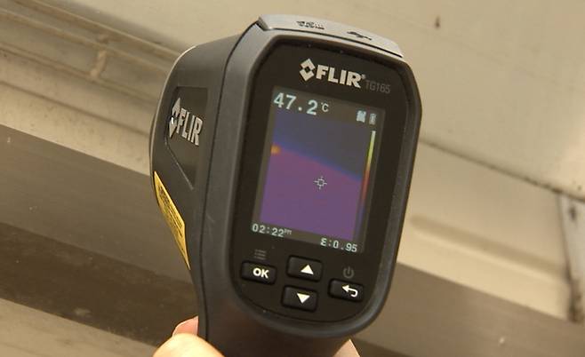 실외기 주변 온도를 측정해 보니 47도, 기온보다 10도 이상 높습니다.