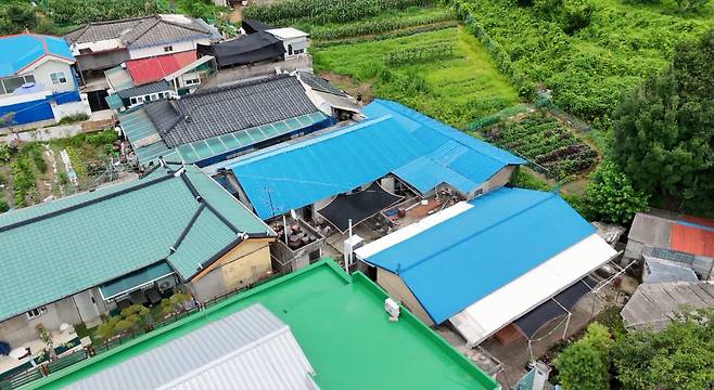 중구 산성동을 하늘에서 내려다보니, 상당 수 주택이 태양열을 고스란히 머금는 양철 지붕 구조입니다.