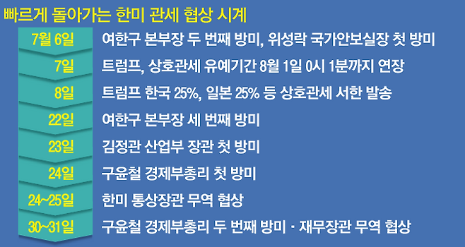 대통령실은 주말에도 회의를 열어 정책·안보 라인이 머리를 맞대고 미국 현지에서 전해지는 정부의 협상 상황을 공유하면서 전략 수립에 나서고 있다. 안보·전략산업·구매·투자 등 여러 단위별 협상 상황을 종합적으로 점검하고, 분야별 협의 성과를 종합적으로 묶어내 관세율 인하라는 최종 목표를 이끌어낸다는 것이다.