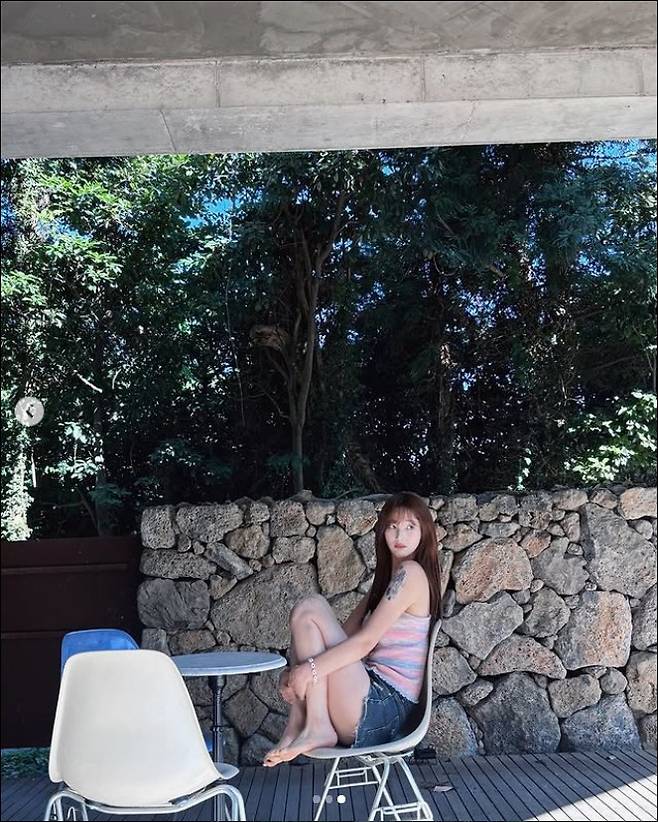 사진 속 그는 핑크빛 민소매 크롭탑과 데님 숏팬츠 차림으로 자연 속에서 여유로운 시간을 보내고 있다.