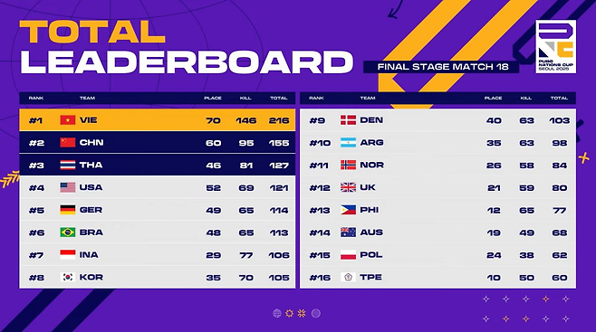 한국은 27일 서울 송파구의 올림픽공원 핸드볼경기장에서 진행한 PUBG 네이션스 컵(PNC) 2025 파이널 스테이지(결승) 3일 차 경기(매치13~18)에서 23점을 누적하며 3일간 도합 105점을 쌓고 8위로 마무리했다.