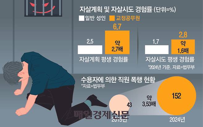 최근 법무부가 발간한 2025 교정통계연보에 따르면 지난해 교정공무원의 정신건강 요인 중 수면문제, 번아웃, 단절감, 불안, 우울이 가장 심각한 것으로 나타났다. 이런 연장선에서 교정공무원은 일반 성인에 비해 자살계획 평생 경험률이 약 2.7배, 자살시도 경험률이 약 1.6배 높았다.