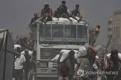 Palestinians carry sacks of flour unloaded from a humanitarian aid convoy that reached Gaza City from the northern Gaza Strip, Sunday, July 27, 2025. (AP Photo/Jehad Alshrafi)