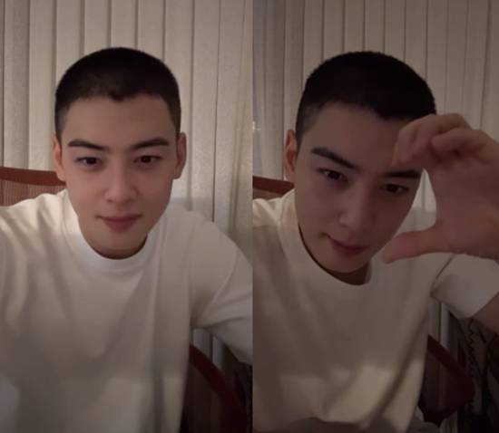 군대를 하루 앞둔 만큼 짧게 머리를 자른 차은우는 "건강히 잘 다녀오겠다. 2~3살 이후로 가장 짧은 것 같다. 어색하다"고 소회를 밝혔다.