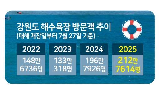 27일 본지 취재를 종합하면 이날 기준 올해 강원도내 해수욕장 83곳의 방문객은 212만7614명으로 집계됐다.