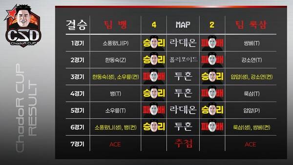 동시에 5, 6시 멀티를 모두 챙기면서 변수까지 차단했다. 12시 멀티가 질럿에 의해 파괴되자 룩삼과 쌍베는 병력 생산의 동력을 잃어버렸다. 결국 GG를 선언, 뱅과 소풍왔니의 승리로 팀 뱅이 4대2로 CSD 차도르컵 우승을 거머쥐었다. 뱅은 해당 승리로 CSD 차도르컵 5승을 기록하며 최다승의 영예도 안았다.
