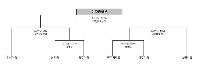12팀이 참가한 여중부 역시 27일 예선 일정을 모두 마친 가운데 A조에선 숙명여중과 봉의중이, B조는 온양여중과 상주여중, C조는 동주여중과 전주기전중이 결선 토너먼트에 진출했다. 예선전이 모두 종료된 뒤 6강 토너먼트 대진 추첨이 진행됐고 그 결과, 예선 3전 전승을 달린 온양여중과 숙명여중이 준결승에 직행하는 행운을 누렸다.