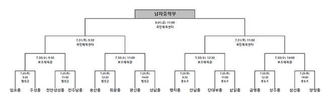 예선전이 끝난 뒤 결선 대진 추첨이 진행됐고 임호중-주성중, 천안성성중-전주남중, 용산중-휘문중, 광신중-성남중, 명지중-안남중, 단대부중-삼일중, 금명중-상주중, 삼선중-양정중의 16강 대진이 완성됐다. 남중부 결선은 29일(화) 오전부터 법성고와 홍농초 체육관 2개소에서 펼쳐진다.