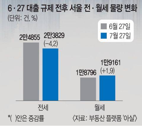 대출 규제 이후로도 서울의 월세 매물은 증가하고 전세는 줄었다. 부동산 플랫폼 아실에 따르면 서울 아파트 전세 매물은 27일 현재 1만9161건으로 대출 규제 발표날인 지난달 27일 1만8796건보다 1.9% 증가했다. 전국 17개 광역시·도 중 유일하게 월세 매물이 증가했다. 강남구에선 아파트 월세 매물이 전세를 추월했다. 27일 기준 강남구의 월세는 5065건으로 전세(4954건)보다 111건 많았다. 한 달 전에는 전세 4986건, 월세 4672건으로 전세가 314건 더 많았다. 우 전문위원은 “전세 시장 불안을 해소하려면 입주량이 충분히 공급되거나 공급에 대한 충분한 시그널이 있어야 한다”고 말했다.