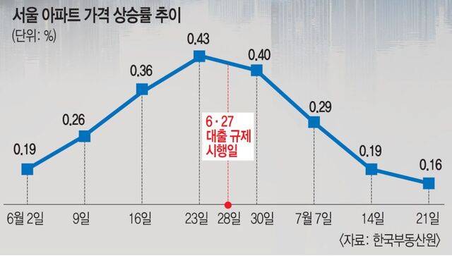 27일 한국부동산원 주간아파트가격동향조사에 따르면 지난달 27일 대출규제 발표 이후 서울 아파트값 상승 폭은 4주 연속 축소됐다. 규제 직전인 6월 넷째주(23일 기준)부터 7월 셋째주(21일 기준)까지 서울 아파트 매매가 상승률은 0.43→0.40→0.29→0.19→0.16%를 기록 중이다. 서울 부동산 매매심리도 급랭 중이다. 서울 아파트 매매수급지수는 7월 셋째주 기준 100.1이다. 매매수급지수(0~200)는 기준점 100을 넘으면 수요가 공급보다 많다는 뜻이다. 지난달 23일 기준으로 104.2까지 올랐으나 규제 직후 4주 연속 하락했다.
