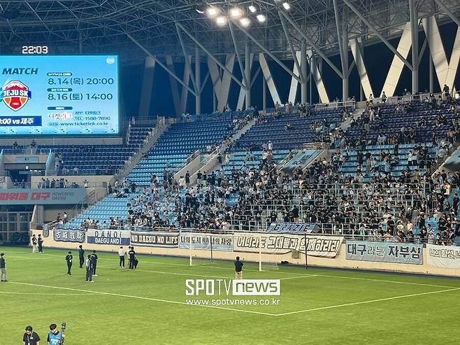 울분섞인 항의는 좀처럼 가라앉지 않았다. 구단 관계자와 팬들 사이에 꽤 오랜 대치가 지속됐다. 반대쪽에서는 대구FC를 응원했던 걸개를 찢으며 “잘해봐라”라고 소리치는 팬도 있었다. 그동안 힘겹게 잔류하고 생존했던 팀이지만, 올해만큼은 어느때보다 강등 가능성이 높아졌으니 분노를 삭히기 힘들었을 테다.