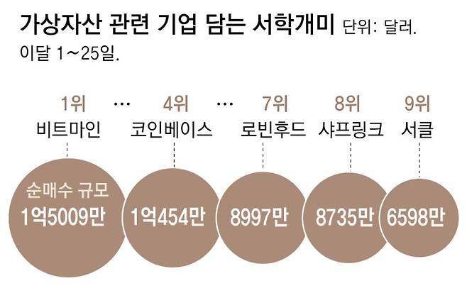 미국 증시에 투자하는 이른바 서학개미의 투자금이 가상자산 관련 기업으로 몰리고 있다.
