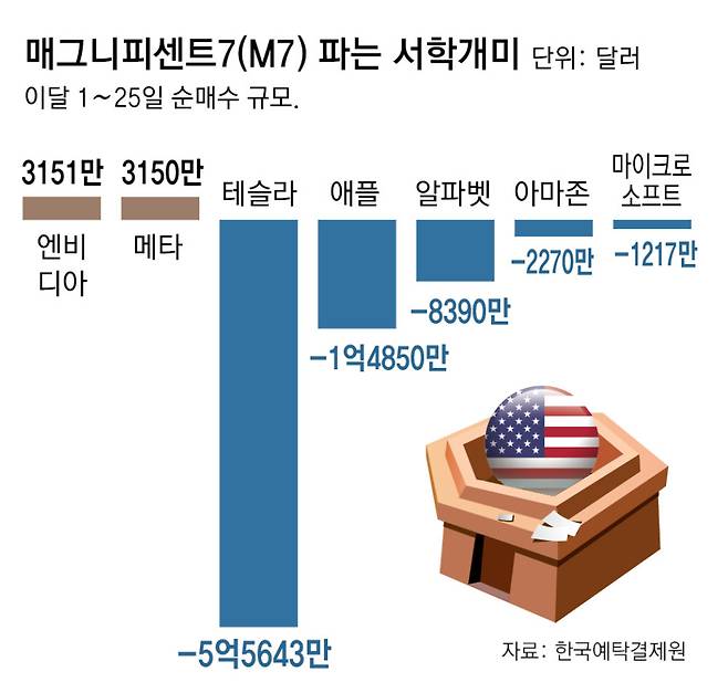 미국 증시에 투자하는 이른바 서학개미의 투자금이 가상자산 관련 기업으로 몰리고 있다. 반면 미국 증시 성장을 주도해온 7개 빅테크인 이른바 ‘매그니피센트7(M7)’ 주식은 팔고 있는 것으로 나타났다.