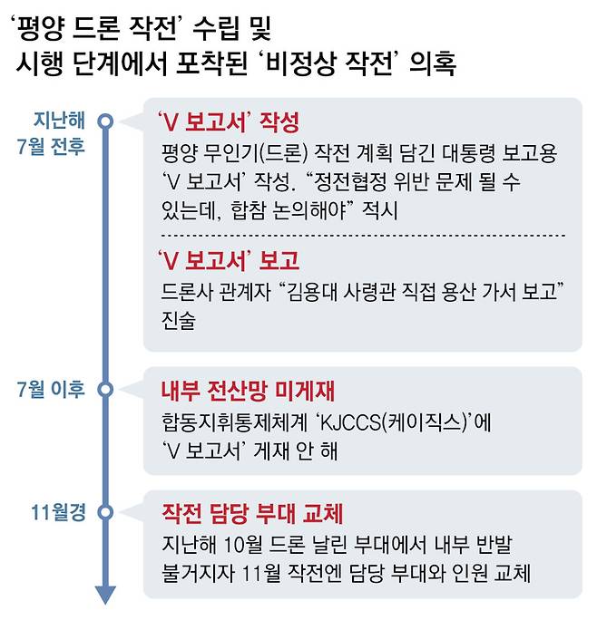 평양 무인기(드론) 작전 기획에 관여했던 드론작전사령부의 한 관계자는 지난해 7월경 용산 대통령실에 보고하기 위해 작성한 ‘V(대통령) 보고서’의 건의사항 항목에 이 같은 의견을 적었다고 한다. 우리 군이 비무장지대를 통과해 북한 영공에 드론을 날려보내는 건 정전협정 위반으로 이어질 수 있어 드론사 내부에서만 계획을 수립할 게 아니라 드론사를 지휘하는 합참과 논의해야 한다는 의견이었다. 특검은 이런 ‘V 보고서’ 내용에 비춰 볼 때 드론 작전 계획을 수립하고 대통령실에 보고하는 일련의 과정에서 드론사가 합참을 패싱한 게 아닌지 의심하고 있다.