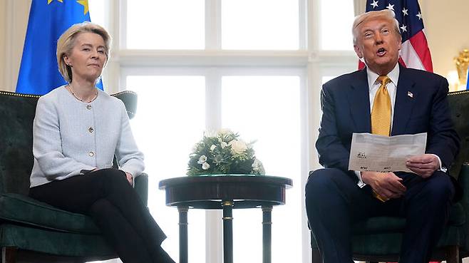 도널드 트럼프 미 대통령은 이날 영국 스코틀랜드 턴베리에서 우르줄라 폰데어라이엔 EU 집행위원장과 회동한 뒤 기자들에게 이같이 밝혔습니다.