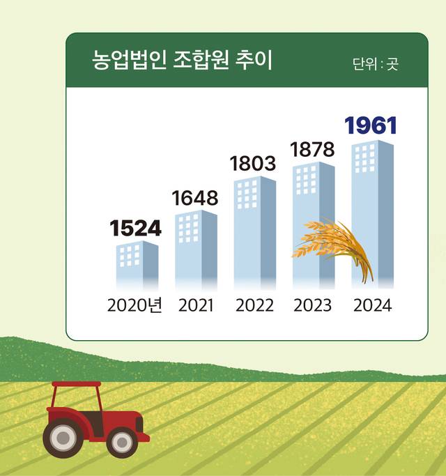 농업법인수가 급증하면서 농축협에 조합원으로 등록한 농업법인도 덩달아 늘어나고 있다. 농협중앙회 회원지원부에 따르면 2020년 1524곳이었던 농업법인 조합원수는 지난해 1961곳으로 28.7% 증가했다.