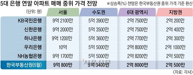 상승폭에 대해서는 은행마다 온도 차가 있다. 지난 5월 한국부동산원 아파트 중위 매매 가격은 서울 9억 800만원, 수도권 5억 3400만원, 6대 광역시(부산·대구·인천·대전·광주·울산) 2억 8000만원, 지방권 2억 500만원 수준이다. 우리은행은 이를 기준으로 올해 말 서울 아파트 중위 매매 가격이 10억원으로 오른 뒤 내년 상반기에는 10% 오른 11억원까지 뛰어 하반기까지 이런 수준이 유지될 것이라고 봤다.
