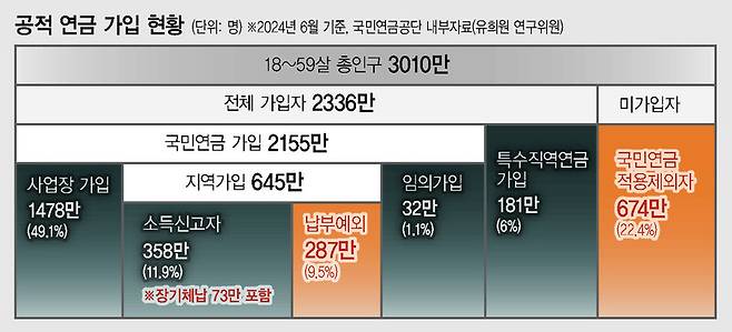 국민연금연구원 분석을 보면, 지난해 6월 기준 국민연금 사각지대는 18~59살 인구 3010만명 가운데 1034만명(34.4%)에 이른다. 적용 제외자 674만명에다 납부 예외자 287만명, 장기 체납자 73만명이 반영된 규모다. 적용 제외자에 학생, 무소득 배우자 등이 포함되는 것을 고려해, 납부 예외자와 장기 체납자를 협의의 사각지대로 보기도 한다. 납부 예외자는 실직 등으로 소득이 없어 보험료 납부를 면제해주는 것이고 장기 체납자는 13개월 이상 보험료가 밀린 경우다.