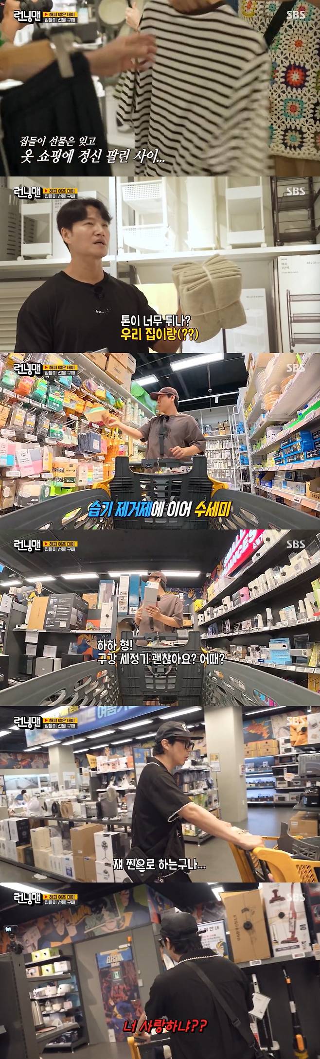 최근 이사한 김종국도 수건을 들곤 "톤이 너무 튀나? 우리 집이랑?"이라며 살림살이 확보에 나섰고, 어느새 지석진은 옷 4벌을 들고 있는 모습이 포착돼 웃음을 더했다.