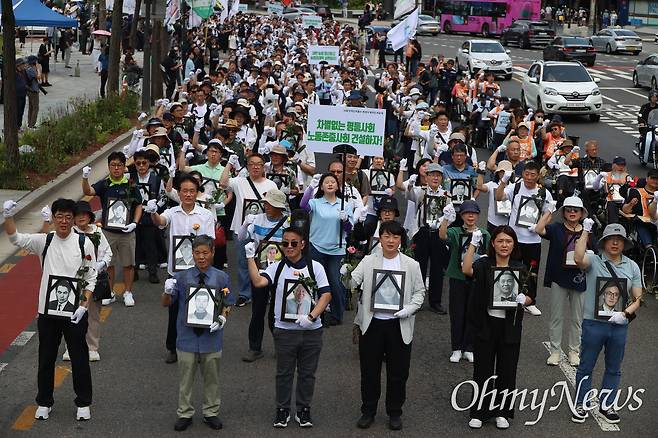 | ▲ 제34회 민족민주열사희생자 범국민추모제가 열리는 6월 15일 오후 서울시 종로구 열린송현녹지광장에 모인 참가자들이 영정사진을 들고 본행사가 열리는 서울시청앞까지 행진하고 있다. |