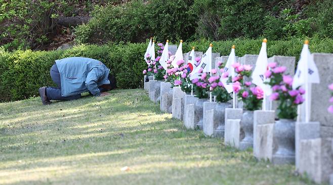 | ▲ 4.19혁명 기념일인 19일 오후 서울 강북구 4.19 민주묘지를 찾은 한 유족이 아버지 묘역에 절을 하고 있다. |