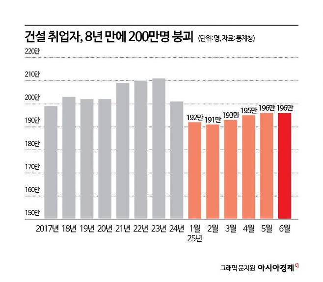 건설 경기 한파의 직격타는 취약계층인 일용 근로자들에게 닥친다. 건설업 고용을 상징하던 '200만명'이라는 숫자는 올해 1월 무너졌다. 2017년 이후 8년 만이다. 이어 6개월째 190만명대에 머물고 있다. 통계청에 따르면 올해 6월 기준 건설업 취업자 수는 196만명으로 전년 대비 9만7000명 줄었다. 14개월 연속 감소세다.